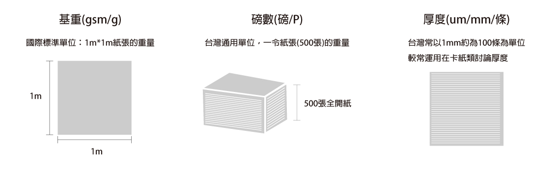 首先可以先了解紙張的單位名詞,「基重(gsm/g/m²)」、「磅數(P)」、「條(um/mm)」
