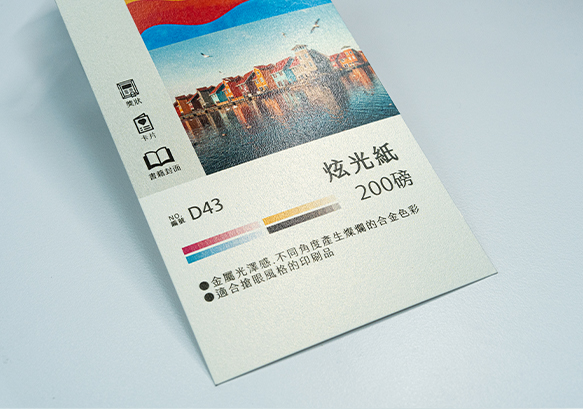 磅數為120磅,表面獨特金屬光澤感,不同角度會產生不同炫麗、燦爛五光十色的合金色彩,適合呈現搶眼風格的印刷品,卡片、封面、書籍皆適用!