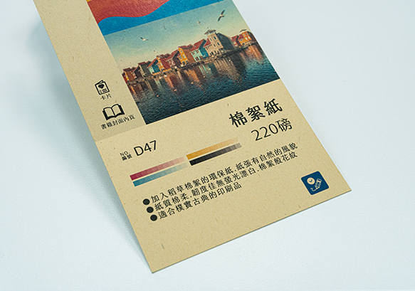 磅數為120磅(需先詢問門市是否備有庫存),紙漿中加入稻草棉絮的環保紙,讓紙張呈現有自然的風貌。紙質棉柔、韌度佳無螢光漂白,棉絮般的花紋,常用於封面、卡片吊牌、提袋包裝,適合樸實古典的印刷品。