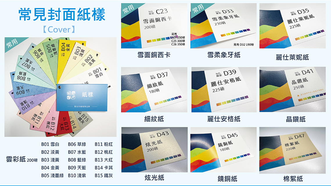 磅數為200磅,廣泛使用於論文、報告書封面的美術工藝用紙,紙面呈現雲彩花紋,厚實不易破損,顏色鮮艷,壓紋清晰,也能在許多手工藝的卡片、紙雕等看見它的運用。
