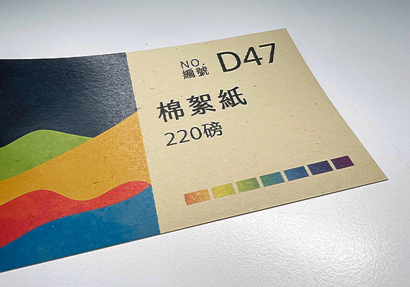 磅數為225磅,呈現纖維質感、紙面不規則細緻十字紋理,屬於吸墨性高,印刷後顏色較深,呈現出自然藝文的風格美術紙,適合呈現典雅風格的印刷品。