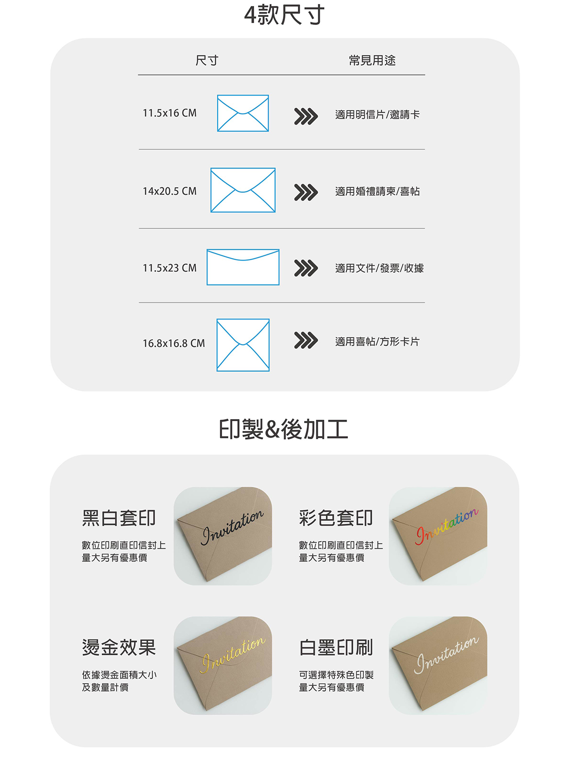 信封套印細節可聯繫我們專員溝通,減少加工產生之問題。